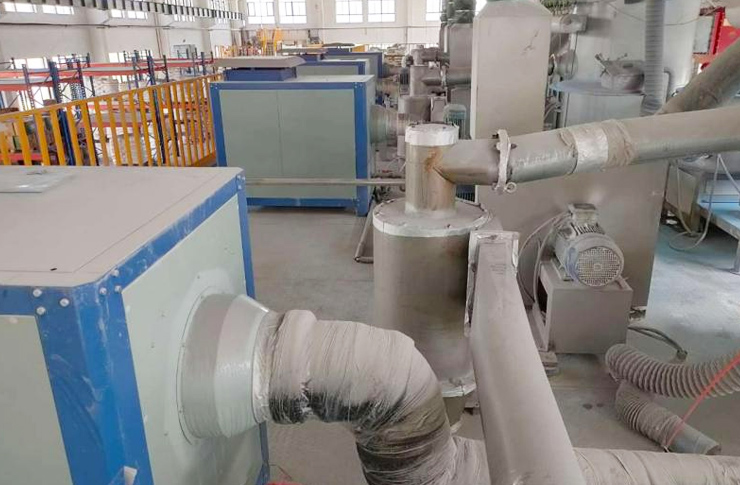 Workshop total 4 300kg/h powder production line, choose Kingfit powder cold dryer unit QFM400S / 4 sets, extrusion and tablet pressing machine choose a 100kw refrigeration capacity of dry scroll chiller.