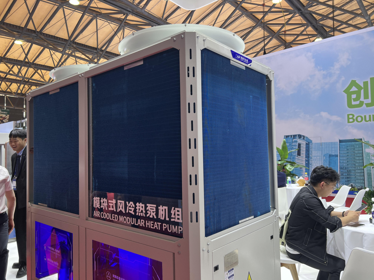 除全球首发的特种高温磁悬浮热泵外,另一款新品单元水(风)冷柜式机组,也以其灵活的出风模式、广泛的场景适用性、卓越的产品性能,吸引了国内外众多行业客户驻足交流了解。