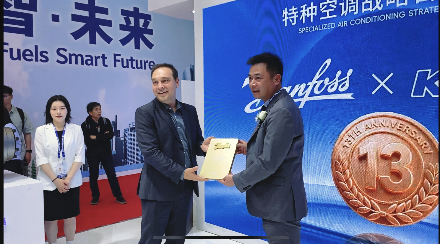 丹佛斯全球副总裁Frank Ford莅临现场举行授牌仪式,并回顾了13年来与青风环境的协同创新,对青风在工农业特种空调领域大力推广磁悬浮压缩技术表示了肯定与感谢,并对未来双方的进一步深入合作表达了期待。