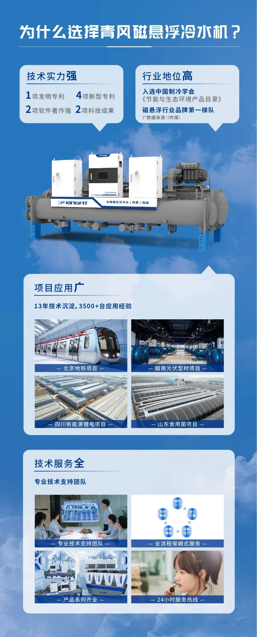 青风磁悬浮产品拥有核心自主知识产权,形成了水冷、风冷、蒸发冷、热泵全系列的产品矩阵,以过去10余年在工农业领域充分深耕和3500+台的应用经验,成为细分领域的“隐形冠军”。同时近年来,青风磁悬浮产品积极拓展商业应用等更多场景,在轨道交通、建筑空调、数据中心等新领域发挥更高效的节能实力。