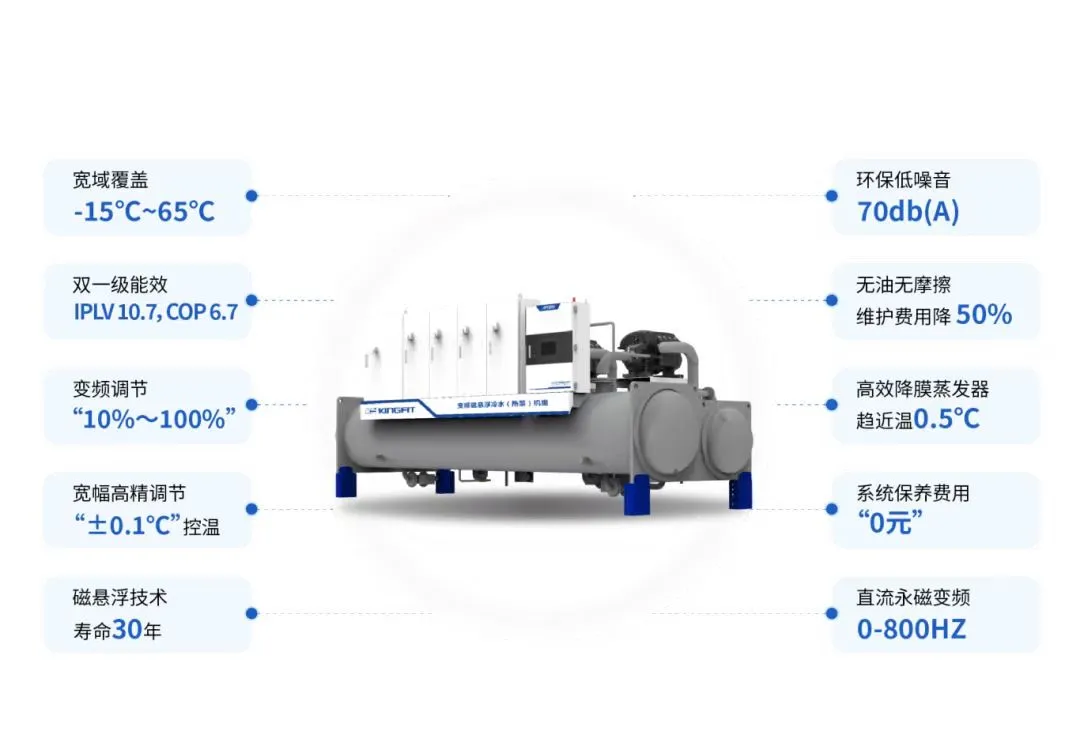 青风变频磁悬浮2020欧洲杯夺冠热门 组采用先进的磁悬浮压缩机技术、交流变频控制技术、无油润滑技术、降膜蒸发技术,高效节能50%,精准控温±0.1℃,宽域覆盖-15~65℃,无油系统“0”维护,使用寿命30年,静音低噪≤72分贝,环保冷媒对大气臭氧无破坏。广泛应用于工业生产、楼宇净化、新能源、数据中心、储能等领域。